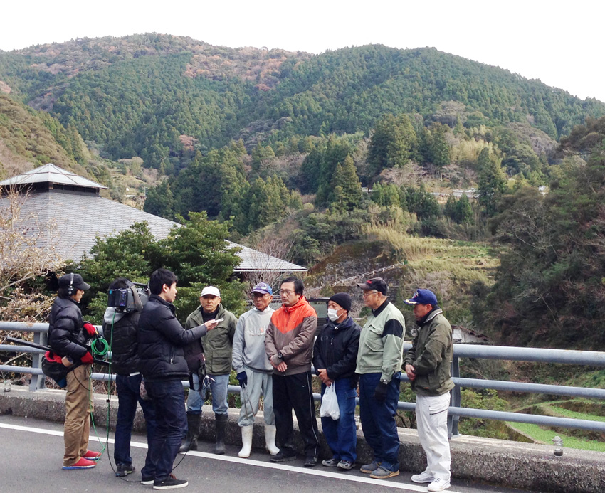 (毎年12月に地域で開催しているイベント「清流鏡川棚田キャンドル」の準備中に、メディアの取材を受けている「中川をよくする会」のみなさん)