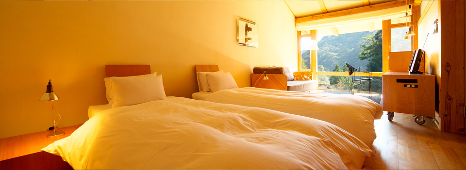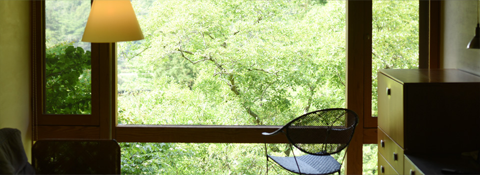 坐在寬敞舒適的沙發上,就算您是第一次來訪,也能輕易地像在家裡一樣自在。身處寂靜之中,放鬆心靈,聆聽大自然的聲音。忘卻種種煩惱,盡情享受一切。窗外綠樹成蔭,身處室內也能輕鬆地和大自然一起呼吸,這12間房間可謂是人類心靈的巔峰之作。